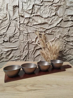 Набор из 4 салатников на деревянной подставке с ручкой