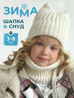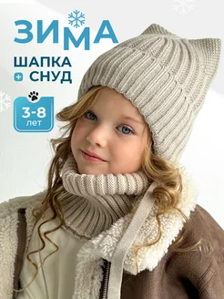 Зимняя шапка с ушками на завязках и снуд детский