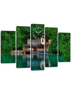 Модульная картина с часами Домик у озера 140х80