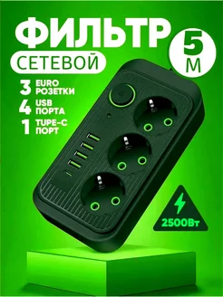 Сетевой фильтр на 3 евро-розетки и 4 USB кабель 5м