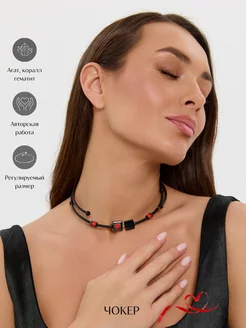 Чокер колье из натурального черного агата и коралла