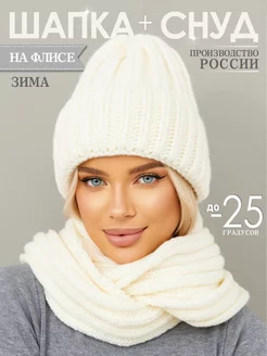 Шапка зимняя вязаная со снудом на флисе бини