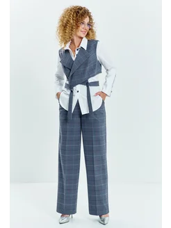 Офисный костюм тройка с блузкой и жилетом в клетку