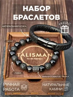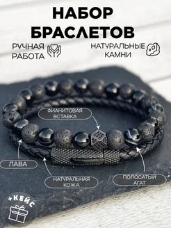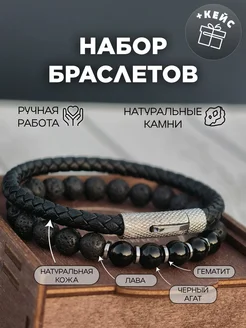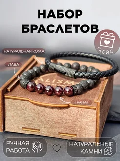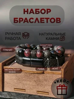 Набор Браслетов из натуральных камней гранат, лавы и кожи
