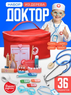 Набор доктора детский деревянные игрушки 36 шт + халат врача