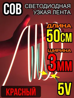 Светодиодная узкая COB лента 5В 480LED м 50см красный