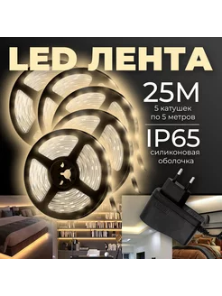Светодиодная лента с блоком 25м (5 катушек) теплый белый