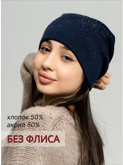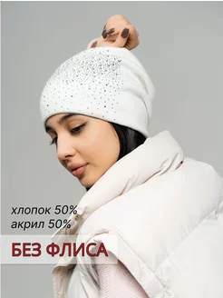 Шапка бини весенняя вязаная со стразами фиксированная сзади