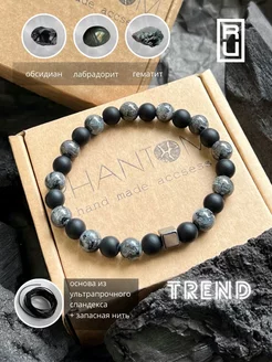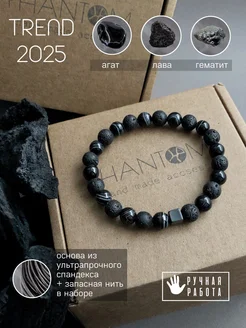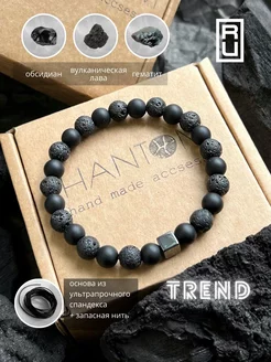 Браслет мужской кожаный с обсидианом и вулканической лавой