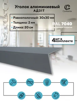 Уголок алюминиевый 30х30 2 мм, 20 см, 4 шт, серый