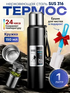 Термос 1 литр для чая металлический с кружкой и ситечком