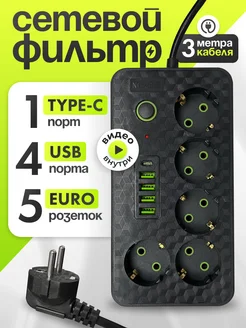 Сетевой фильтр 3 метра Удлинитель с USB и Type-c