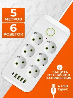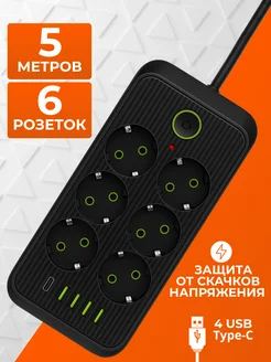 Сетевой фильтр 5 метров 6 розеток с USB и Type-C удлинитель