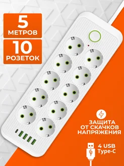 Сетевой фильтр 5 метров 10 розеток с USB и Type-C удлинитель