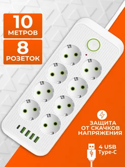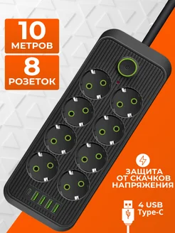 Сетевой фильтр 10 метров 8 розеток с USB и Type-C удлинитель
