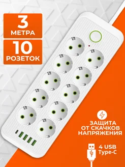 Сетевой фильтр 3 метра 10 розеток с USB и Type-C удлинитель