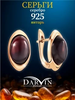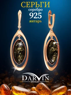 Серебряные серьги с янтарем позолоченные длинные овальные