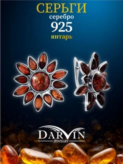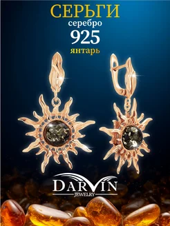 Серьги серебряные позолоченные с натуральным янтарём солнце