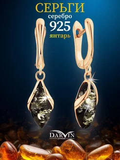 Серьги серебряные позолоченные с натуральным янтарём артдеко