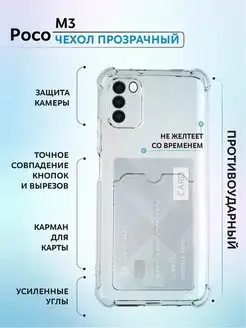 Чехол на Poco M3 прозрачный с усиленными углами и карманом
