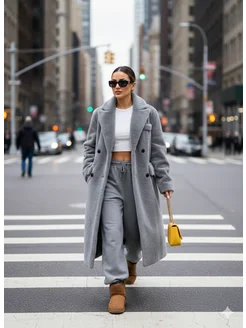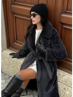 Шуба искусственная экошуба без капюшона с поясом темно-серая