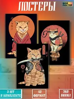 Постеры аниме котик самурай - 3 штуки