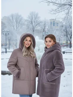 Двусторонняя дубленка зимняя с капюшоном большие размеры