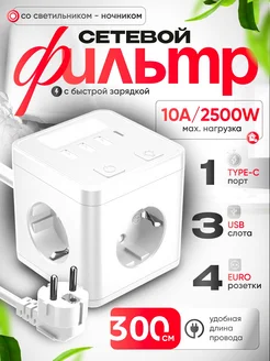 Сетевой фильтр тройник с USB удлинитель белый 3М