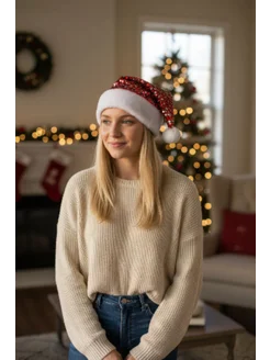 Новогодняя пушистая шапочка колпак пайетки снежинки