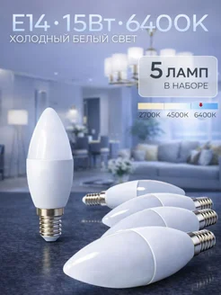 Светодиодная лампочка E14 15В 6400k холодный свет свеча