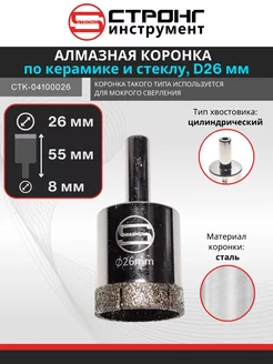 Коронка по стеклу и керамике алмазная, D 26 мм, СТК-041