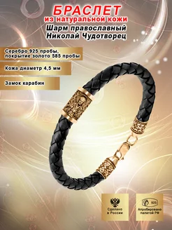 Браслет кожа 4,5 мм оберег шарм Николай Чудотворец серебро