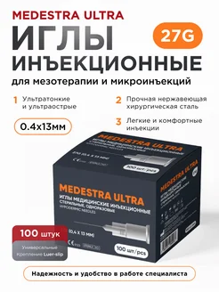 Иглы для мезотерапии инъекционные 27G, 0.4x13 мм 100 штук