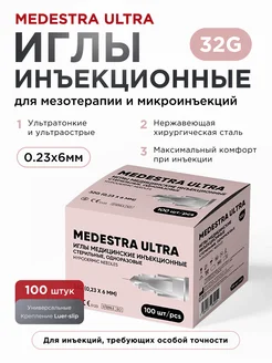 Иглы для мезотерапии инъекционные 32G, 0.23х6 мм 100 штук