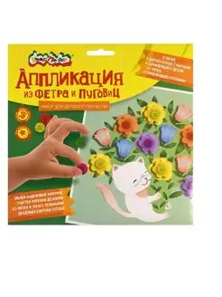 Аппликация из фетра и пуговиц Котик с цветами 20х20 см