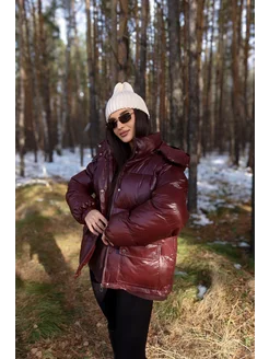 Пуховик женский бордовый зимний оверсайз куртка с капюшоном