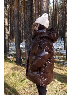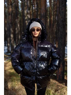 Пуховик женский чёрный оверсайз с капюшоном лакированный