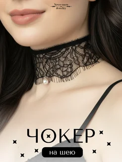 Чокер на шею "Ariel" кружевной с жемчужной подвеской. Черный