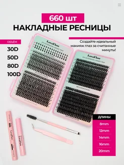 Набор накладных ресниц с клеем, пучки D 660шт