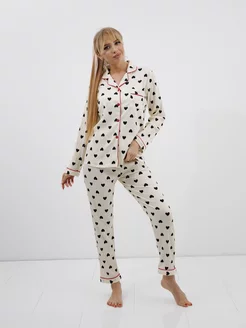 Пижама со штанами и рубашкой с сердечками теплая хлопковая