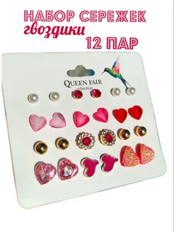 Набор серьги - пусеты "Сердечки" 12 пар