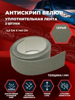 Антискрипная лента велюр для авто Серый - 1х25х1400 мм 2шт