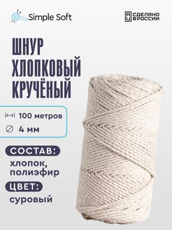 Шнур для вязания хлопковый белый 4 мм 100м