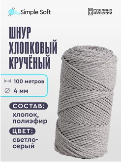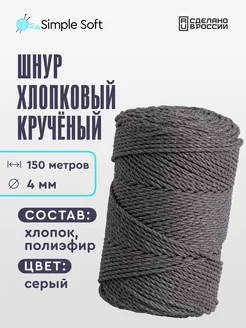 Шнур для рукоделия хлопковый серый 4мм 150м