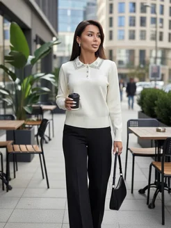 Поло вязаное с длинным рукавом трикотажное с камнями
