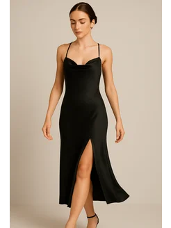 Платье вечернее атласное миди с разрезом комбинация