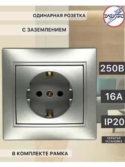 Розетка с заземлением, цвет серебро МИРА+ рамка
