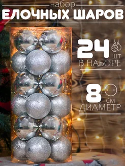 Елочные шары набор 8см, 24шт, серебристый глянец с глиттером