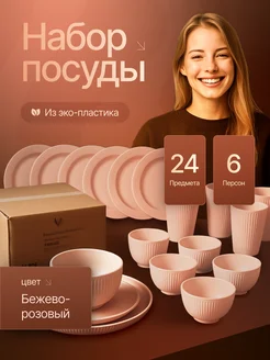 набор посуды из пластика бежево-розовый 24 предмета