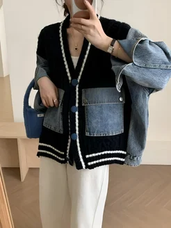 Кардиган вязанный оверсайз комбинированный джинсовый